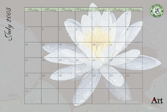 Here's my second year design, for the month of July (2005). This design was using the flower of the month and again creating a functional and usable calendar. One complaint that some of the non-Art Department employees had about the Graphic Designers' designs was they lacked the option to write in notes or dates. My designs seemed to be favored because those were part of the functionality of my design.