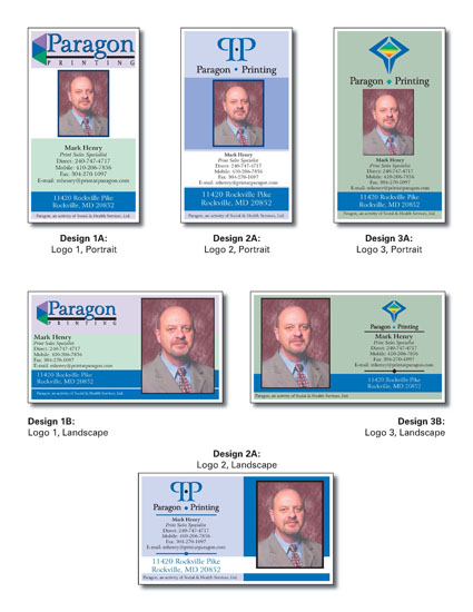 While working at SHS, I was selected to design the logo and collateral materiels for a division called Paragon Printing. The logo in the Design3 options was chosen as well as the horizontal business card layout. The logo and design was applied to a variety of other materials, from stickers to note pads to folders.