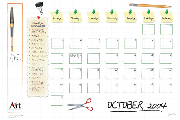 A calendar design that was an Art Department internal project for one year, with each Art Department member taking a month. The concept was so popular that the rest of the company wanted the calendars as well, and we continued the exercise through a second year. I was responsible for October in the first year (2004). I was going for both functionality and the concept of a calendar you could keep on your desk.